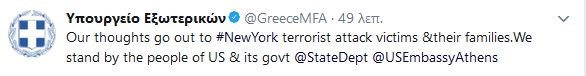 «Οι σκέψεις μας είναι στα θύματα της τρομοκρατικής επίθεσης στη Νέα Υόρκη και στις οικογένειές τους. Είμαστε στο πλευρό του λαού των Ηνωμένων Πολιτειών και της κυβέρνησης του» αναφέρει στα αγγλικά το tweet του υπουργείου Εξωτερικών.