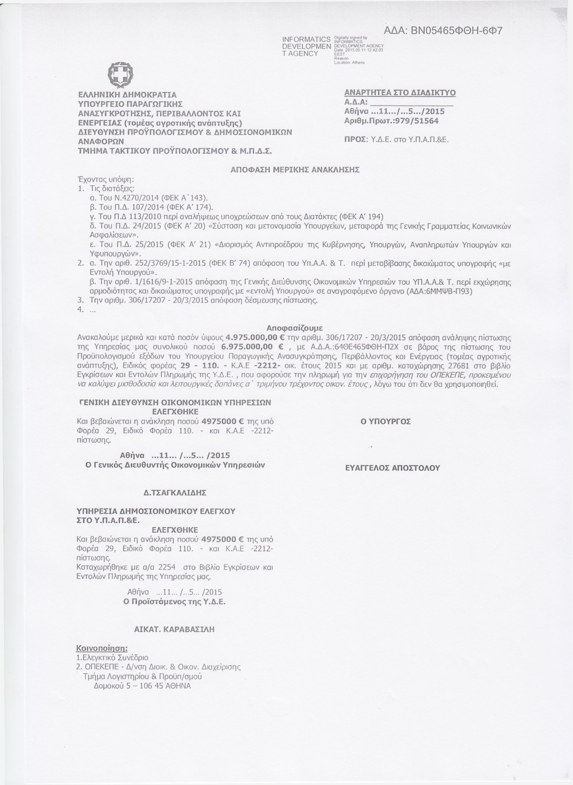 Η ΝΔ επισυνάπτει την απόφαση μερικής ανάκλησης του αρμοδίου υπουργού κ. Αποστόλου, σύμφωνα με την οποία – όπως σημειώνει η Συγγρού- “ανακαλείται μερικώς ποσό ύψους 4.975.000 ευρώ, που αφορούσε στην πληρωμή για την επιχορήγηση του ΟΠΕΚΕΠΕ, προκειμένου να καλυφθεί η μισθοδοσία”.