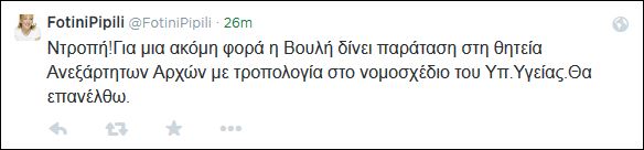 Την δυσαρέσκειά της για τον τρόπο με τον οποίο πέρασε από την βουλή η παράταση της θητείας των Ανεξάρτητων Αρχών εκφράζει η Φωτεινή Πιπιλή με μήνυμα στον προσωπικό της λογαριασμό στο Twitter.