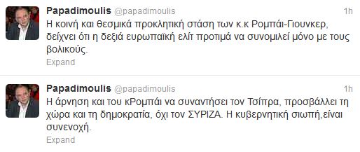 Το «Όχι» των Γιούνκερ και Ρομπάϊ για συνάντηση με τον Αλέξη Τσίπρα, προκάλεσε την οργή του Δημήτρη Παπαδημούλη.Ο Κυβερνητικός Εκπρόσωπος Τύπου του ΣΥΡΙΖΑ σχολίασε σχετικά στον προσωπικό λογαριασμό του στο Twitter: «Η κοινή και θεσμικά προκλητική στάση των κ.κ Ρόμπεϊ-Γιούνκερ, δείχνει ότι η δεξιά ευρωπαϊκή ελίτ προτιμά να συνομιλεί μόνο με τους βολικούς» και «Η άρνηση και του κ.Ρομπάϊ να συναντήσει τον Τσίπρα, προσβάλλει τη χώρα και τη δημοκρατία, όχι τον ΣΥΡΙΖΑ. Η κυβερνητική σιωπή είναι συνένοχη».