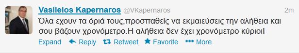 “Όλα έχουν τα όριά τους, προσπαθείς να εκμαιεύσεις την αλήθεια και σου βάζουν χρονόμετρο. Η αλήθεια δεν έχει χρονόμετρο κύριοι!”, έγραψε στο twitter ο βουλευτής των Ανεξάρτητων Ελλήνων, ο οποίος είναι ένα από τα μέλη της Προανακριτικής Επιτροπής.