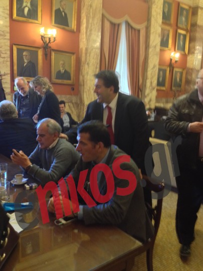 Οι βουλευτές της ΝΔ Δάνης Τζαμτζής και Χρήστος Δήμας, γιος του υποψήφιου Προέδρου της Δημοκρατίας, συζητούσαν σε χαλαρό κλίμα, στο εντευκτήριο της Βουλής, λίγα λεπτά πριν από τη δεύτερη ψηφοφορία για την Προεδρική Εκλογή. Λίγο πιο δίπλα και ο Πύρρος Δήμας.