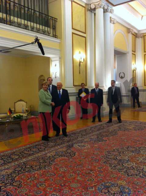 Η χειραψία Παπούλια-Μerkel. Aκριβώς από πίσω τους ο Πρωθυπουργός Αντώνης Σαμαράς, ο οποίος συνόδευσε την γερμανίδα καγκελάριο στο Προεδρικό Μέγαρο.