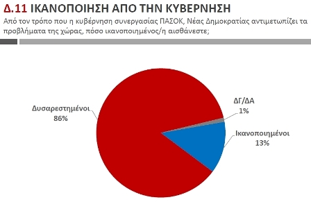 Η πλειονότητα των ερωτηθέντων εκφράζει την δυσαρέσκεια του για την κυβέρνηση σε ποσοστό 86%. Το 66% δεν εμπιστεύεται τον Λ. Παπαδήμο για την επίλυση των οικονομικών προβλημάτων της χώρας, ωστόσο το 48% πιστεύει ότι η χώρα είναι απίθανο να χρεοκοπήσει.