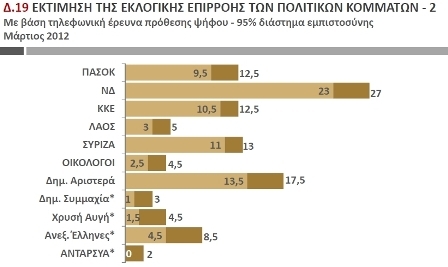 Συγκεκριμένα: ΝΔ 25%, Δημοκρατική Αριστερά 15,5%, ΣΥΡΙΖΑ 12% ΚΚΕ 11,5%, ΠΑΣΟΚ 11% Ανεξάρτητοι Έλληνες 6,5%, ΛΑΟΣ 4%, Οικολόγοι 3,5% Χρυσή Αυγή 3%