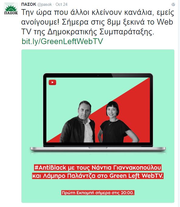 “Την ώρα που άλλοι κλείνουν κανάλια, εμείς ανοίγουμε! Σήμερα στις 8μμ ξεκινά το Web TV της Δημοκρατικής Συμπαράταξης” ανέφερε η ανάρτηση του ΠΑΣΟΚ στα social media.