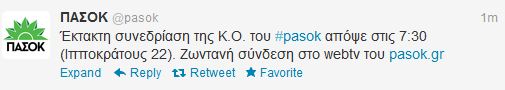 Όπως σας ενημερώσε το enikos.gr, σε προηγούμενες αναρτήσεις, ο Ευάγγελος Βενιζέλος συγκαλεί εκτάκτως την Κοινοβουλευτική Ομάδα του κόμματος. Το ΠΑΣΟΚ, μέσω twitter, επιβεβαιώνει το ρεπορτάζ του enikos.gr για την συνεδρίαση της ΚΟ αλλά και για τη live μετάδοση από το webtv του κόμματος.
