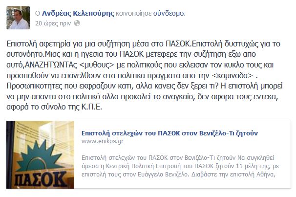 Ο ίδιος που σχολιάζοντας την επιστολή που υπέγραψε με ακόμη δέκα στελέχη την επιστολή προς τον Ευάγγελο Βενιζέλο, έγραψε στο προφίλ του στο Facebook: