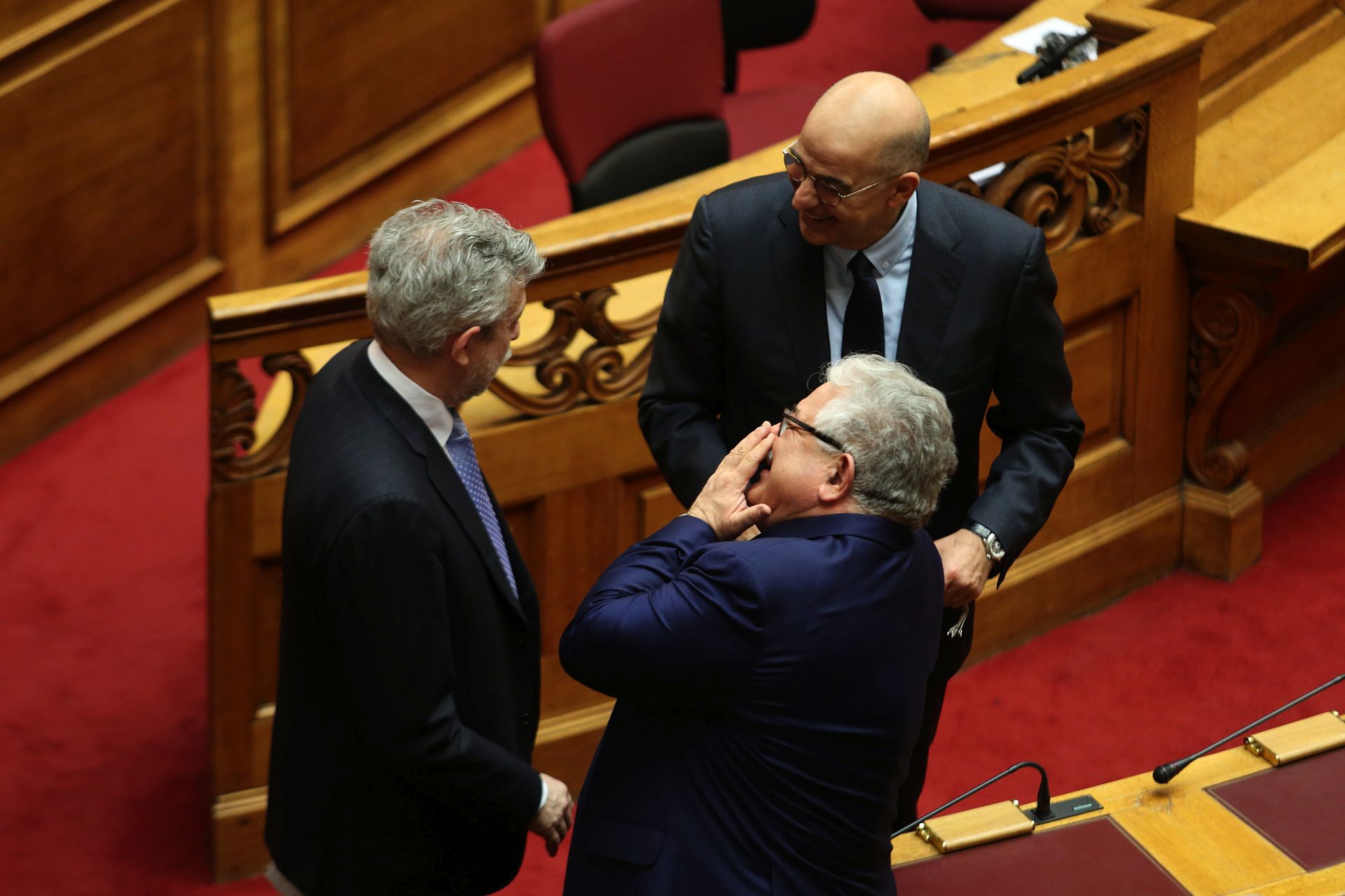 Σε άλλη φωτογραφία ο υπουργός Δικαιοσύνης μιλά με το βουλευτή της ΝΔ Κώστα Τζαβάρα και ο ΥΠΟΙΚ Δημήτρης Παπαδημητρίου συνομιλεί με τον βουλευτή της ΝΔ Νίκο Δένδια.