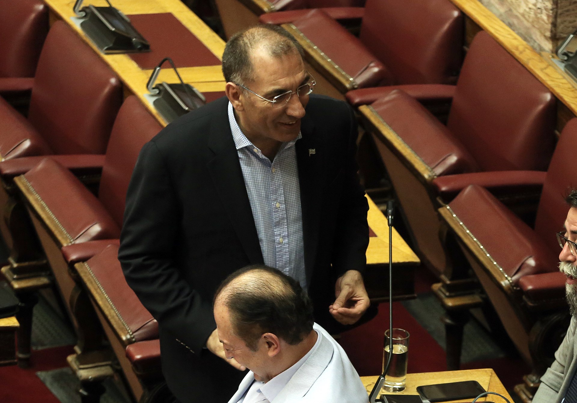 Όπως φαίνεται, ο Δημήτρης Καμμένος, που διαγράφηκε πριν από λίγο καιρό από τους ΑΝΕΛ, κάτι λέει στον βουλευτή της ΝΔ με τον κ. Λαζαρίδη, που επίσης αποτελεί παρελθόν για τους ΑΝΕΛ και ο οποίος κάθεται μπροστά τους, να ακούει και να χαμογελάει.