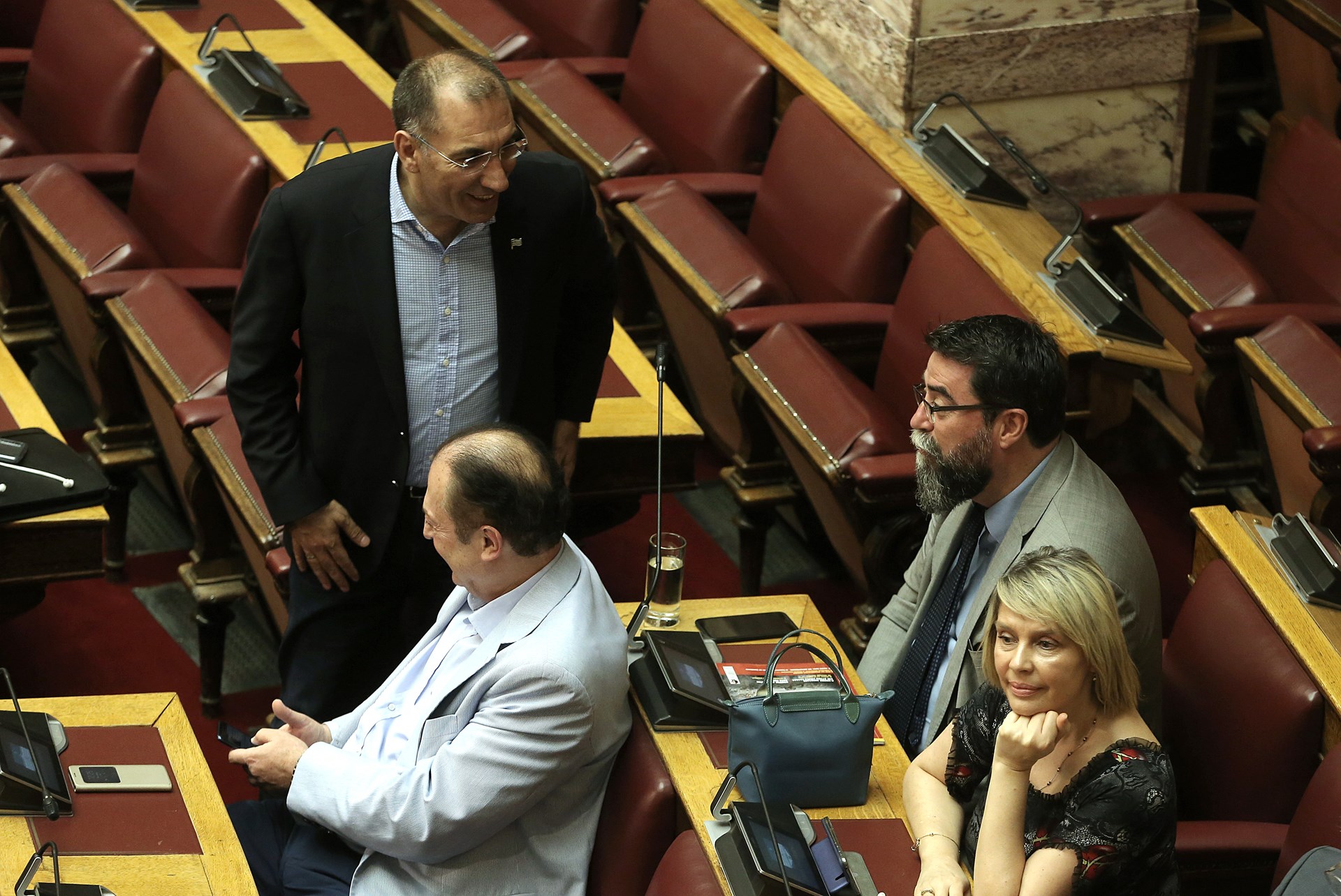 Ο φωτογραφικός φακός «συνέλαβε» τους ανεξάρτητους πλέον βουλευτές Δημήτρη Καμμένο και Γιώργο Λαζαρίδη, μαζί με τον βουλευτή Επικρατείας της ΝΔ Βασίλη Οικονόμου σε ένα «πηγαδάκι» στην αίθουσα της Ολομέλειας.
