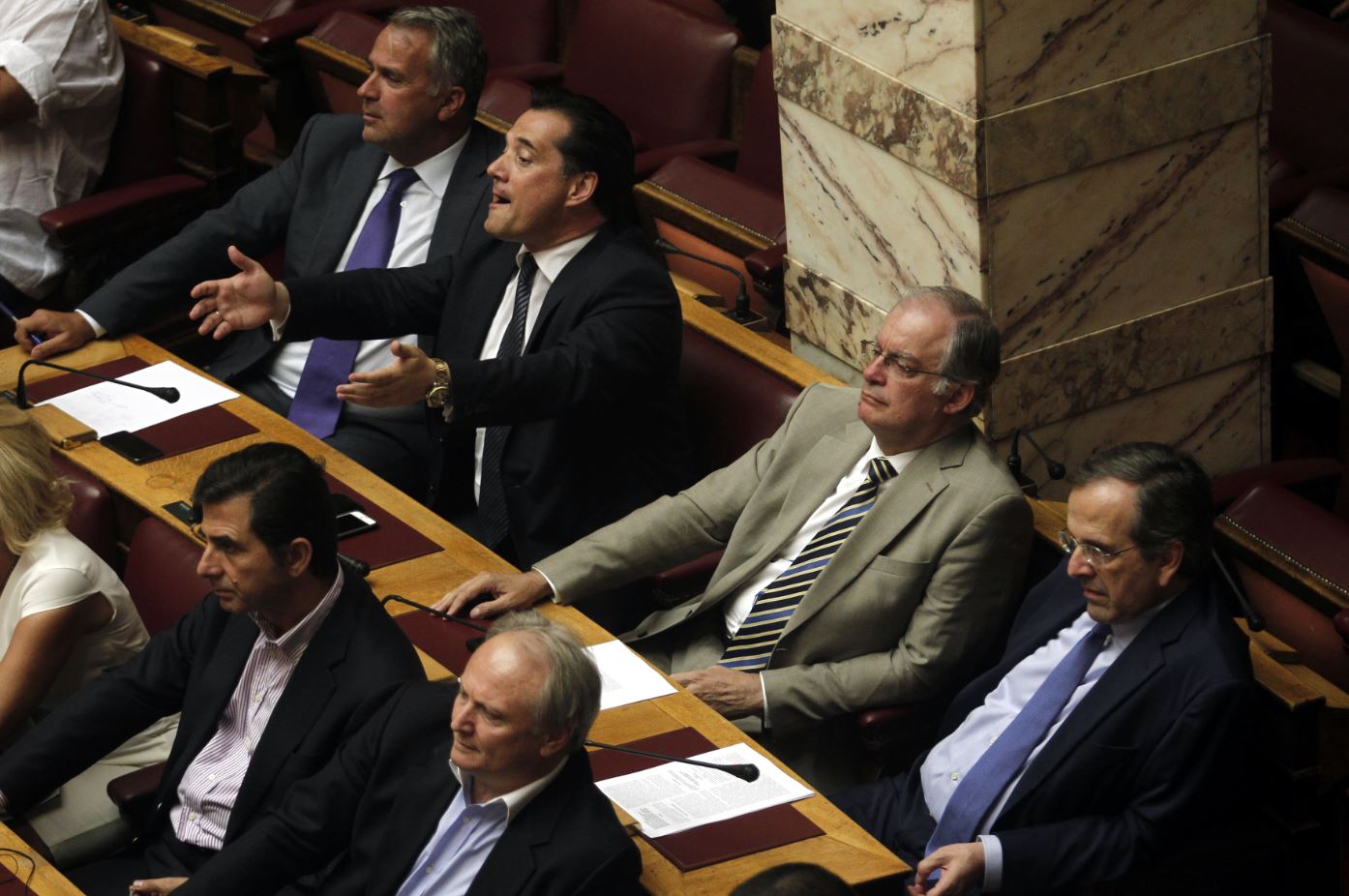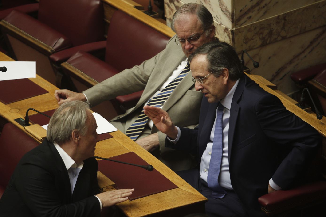 Από τα τελευταία έδρανα της Βουλής παρακολουθεί ο Αντώνης Σαμαράς τη συζήτηση για το νομοσχέδιο με τα προαπαιτούμενα μέτρα της συμφωνίας της Συνόδου Κορυφής.