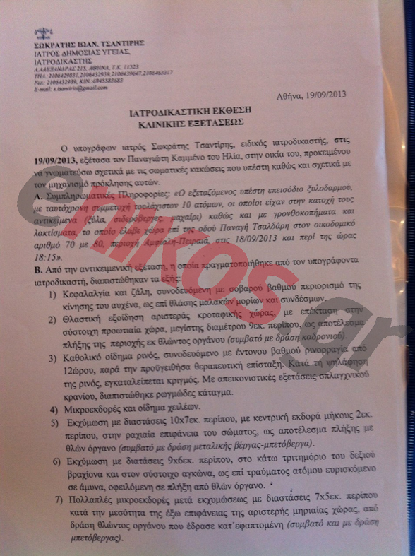 Στο ίδιο μήκος κύματος και η γνωμάτευση του ειδικού ιατροδικαστή Σωτήρη Τσαντίρη, ο οποίος επισημαίνει στα συμπεράσματά του ότι “οι κακώσεις παρέχουν τον χαρακτήρα ως εκ θλώντος οργάνου γενόμενες, δηλαδή προκλήθηκαν από αντικείμενο τα οποία έχουν όγκο, βάρος και αμβλεία επιφάνεια (πχ βέργες, ξύλα , μπετόβεργες, καδρόνια κλπ)”.