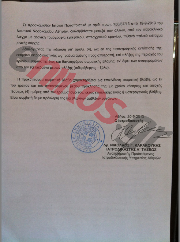 “Αξιολογώντας την κάκωση ως εκ της τοπογραφικής εντόπισής της, εκτιμάται ιατροδικαστώς ως τραύμα αμύνης προς αποτροπή, επί πλήξης της περιοχής του κρανίου, βαρύτατης έως και θανατηφόρου σωματικής βλάβης, εν’ όψει των αναφερόμενων από τον εξεταζόμενο μέσων πλήξης (σιδερόβεργες-ξύλα)” τονίζει ο κ. Καρακούκης.