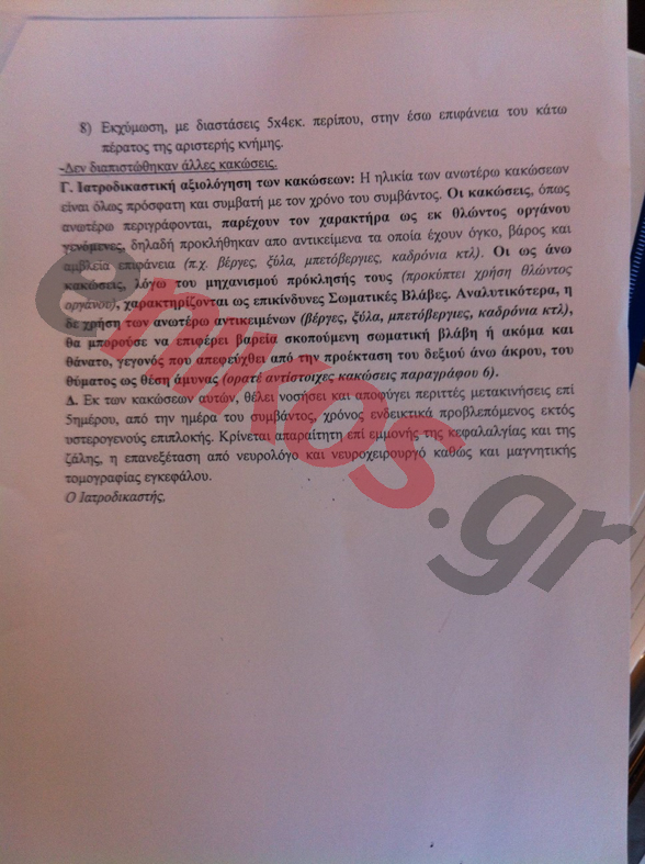 “Οι ως άνω κακώσεις, λόγω του μηχανισμού πρόκλησής τους χαρακτηρίζονται ως επικίνδυνες σωματικές βλάβες”, τονίζει ο ιατροδικαστής, προσθέτοντας ότι θα μπορούσαν να επιφέρουν ακόμα και το θάνατο.