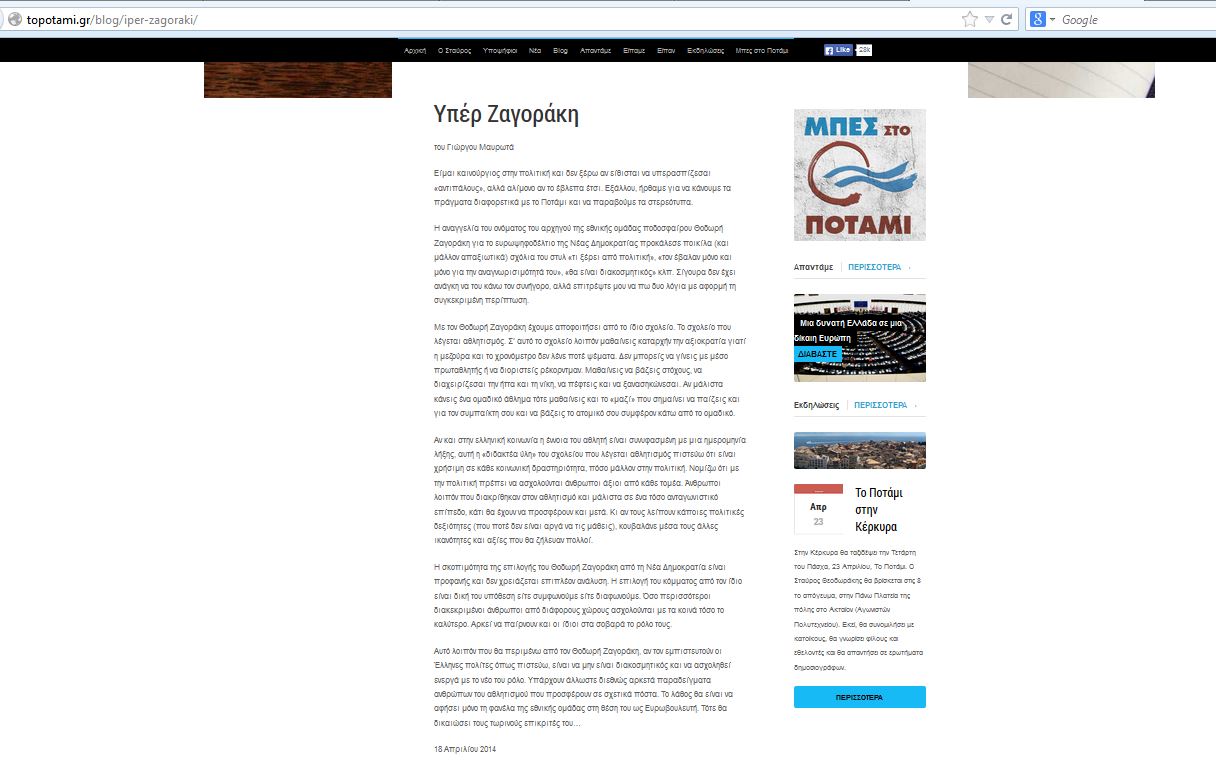 Θετικά αποτιμά την υποψηφιότητα του Θοδωρή Ζαγοράκη στις ευρωεκλογές με την Νέα Δημοκρατία το στέλεχος του Ποταμιού, Γιώργος Μαυρωτάς, με άρθρο του στην επίσημη ιστοσελίδα του κόμματος.
