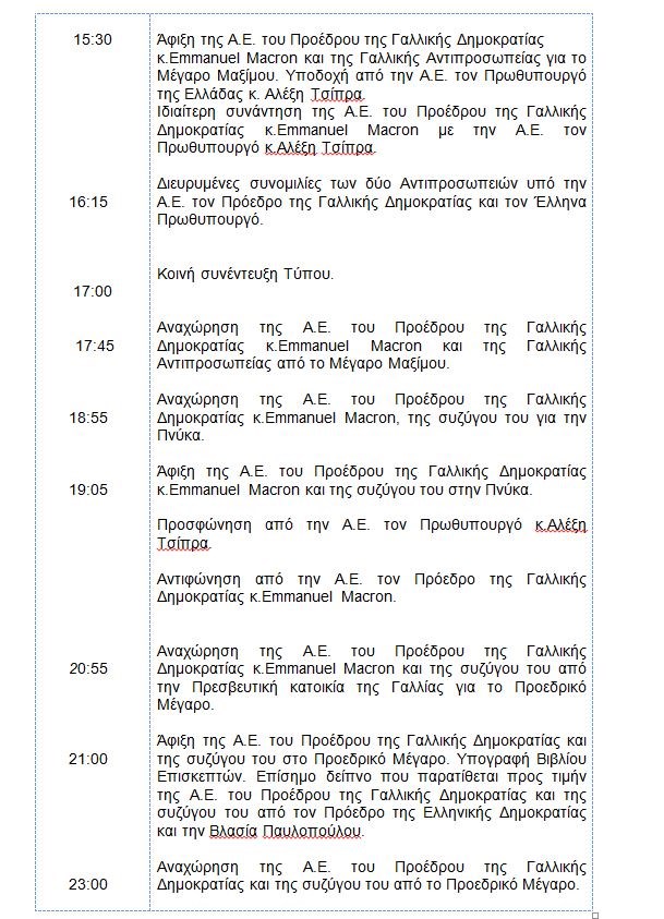 Πριν από λίγο ανακοινώθηκε το πρόγραμμα της επίσημης επίσκεψης του κ. Μακρόν και της συζύγου του, Μπριζίτ στη χώρα μας.Πέμπτη, 7 Σεπτεμβρίου 2017