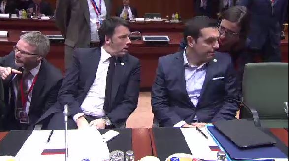 Ο Αλέξης Τσίπρας κάθεται ακριβώς δίπλα στον Ιταλό ομόλογό του Ματέο Ρέντσι ενώ η Άνγκελα Μέρκελ κάθεται στην απέναντι πλευρά του τραπεζιού.