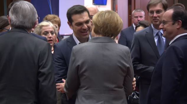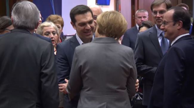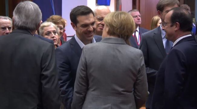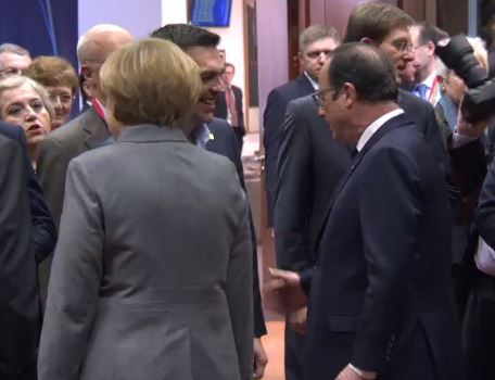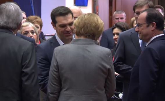Μόλις λίγα λεπτά πριν ξεκινήσει η Σύνοδος Κορυφής συναντήθηκαν για πρώτη φορά ο Έλληνας Πρωθυπουργός Αλέξης Τσίπρας και η Γερμανίδα καγκελάριος Άγκελα Μέρκελ.