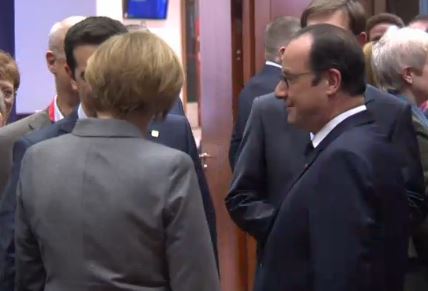 Συνομίλησαν για λίγα δευτερόλεπτα, με τον Γάλλο Πρωθυπουργό, Φρανσουά Ολάντ να τους παρακολουθεί στεκόμενος δίπλα στην Άγκελα Μέρκελ.