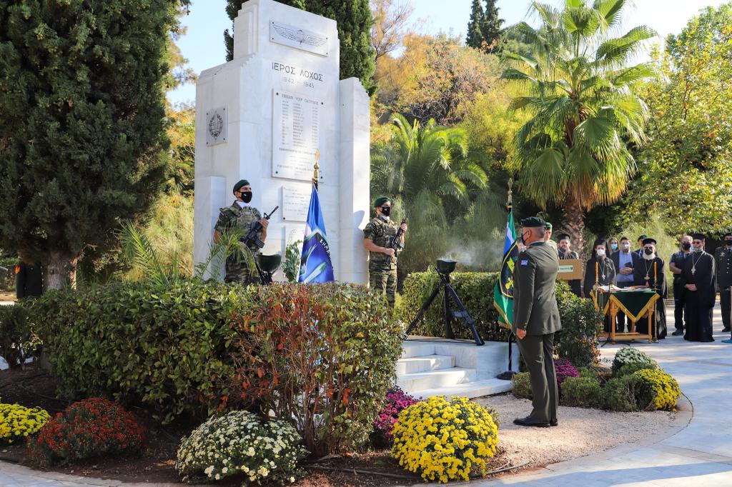 Ο Αρχηγός ΓΕΕΘΑ στο σύντομο χαιρετισμό που απηύθυνε και αποτίωντας φόρο τιμής στους Πεσόντες γενναίους μαχητές που συντέλεσαν καθοριστικά με τη δράση τους στην απελευθέρωση των νήσων της Χώρας μας στο τέλος του Β΄ Παγκοσμίου Πολέμου, αναφέρθηκε στη συγκρότηση του «Ιερού Λόχου» από εθελοντές Έλληνες Αξιωματικούς και οπλίτες όλων των Κλάδων των Ενόπλων Δυνάμεων και των Σωμάτων Ασφαλείας.
