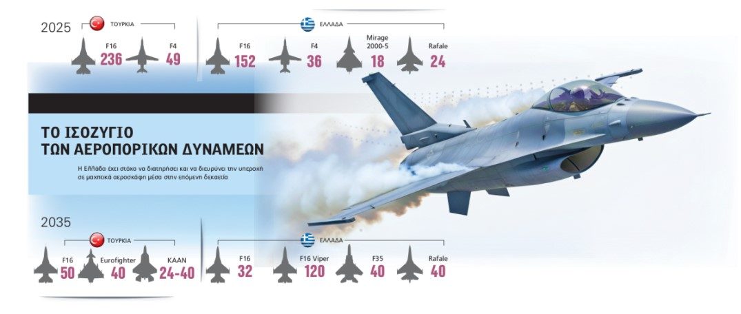 Αυτή τη στιγμή η Αγκυρα διαθέτει περίπου 236 μη αναβαθμισμένα F-16, τα οποία υστερούν έναντι όλων των ελληνικών μαχητικών επί του πεδίου. Σε κάθε περίπτωση, η ηγεσία της Π.Α. δεν θέλει η Ελλάδα να ξαναβρεθεί στην εφιαλτική θέση του 2018. Τότε η Τουρκία φαινόταν ότι θα αγόραζε 100 F-35 και θα αναβάθμιζε τα F-16 της, ενώ η Π.Α. είχε διαθέσιμα μόλις 2 Mirage, δεν υπήρχε η πρόβλεψη προμήθειας F-35 ή Rafale και το πρόγραμμα αναβάθμισης των F-16 ήταν στον αέρα. Επτά χρόνια μετά, η Τουρκία έχει παραμείνει στον ίδιο αριθμό μαχητικών αεροσκαφών… στα χαρτιά. Τα νεότερα μαχητικά που διαθέτει η Αγκυρα είναι της έκδοσης block 50+.