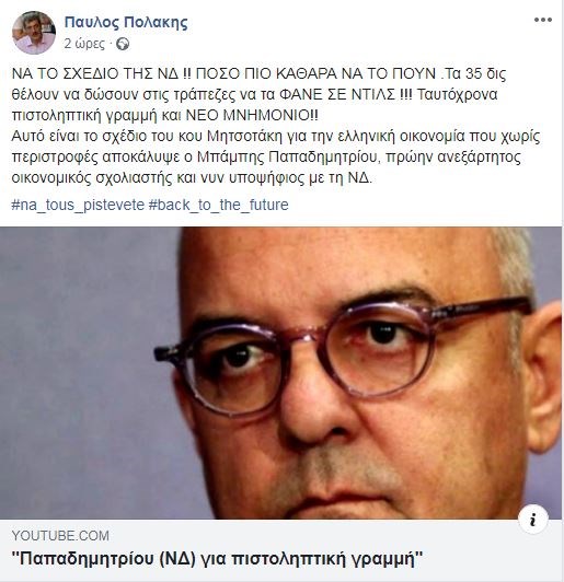 «Να το σχέδιο της ΝΔ. Πόσο πιο καθαρά να το πουν. Τα 35 δισ θέλουν να δώσουν στις τράπεζες να τα φάνε σε ντιλς», έγραψε ο αναπληρωτής υπουργός Υγείας Παύλος Πολάκης στο Facebook σχολιάζοντας όλα όσα είπε ο υποψήφιος της Νέας Δημοκρατίας Μπάμπης Παπαδημητρίου στον Realfm 97,8 περί πιστοληπτικής γραμμής.«Ταυτόχρονα πιστοληπτική γραμμή και νέο μνημόνιο», σημειώνει, επίσης, ο κ. Πολάκης στη σελίδα του στο Facebook. Και προσθέτει: «Αυτό είναι το σχέδιο του κ. Μητσοτάκη για την ελληνική οικονομία που χωρίς περιστροφές αποκάλυψε ο Μπάμπης Παπαδημητρίου , πρώην ανεξάρτητος οικονομικός σχολιαστής και νυν υποψήφιος της ΝΔ».