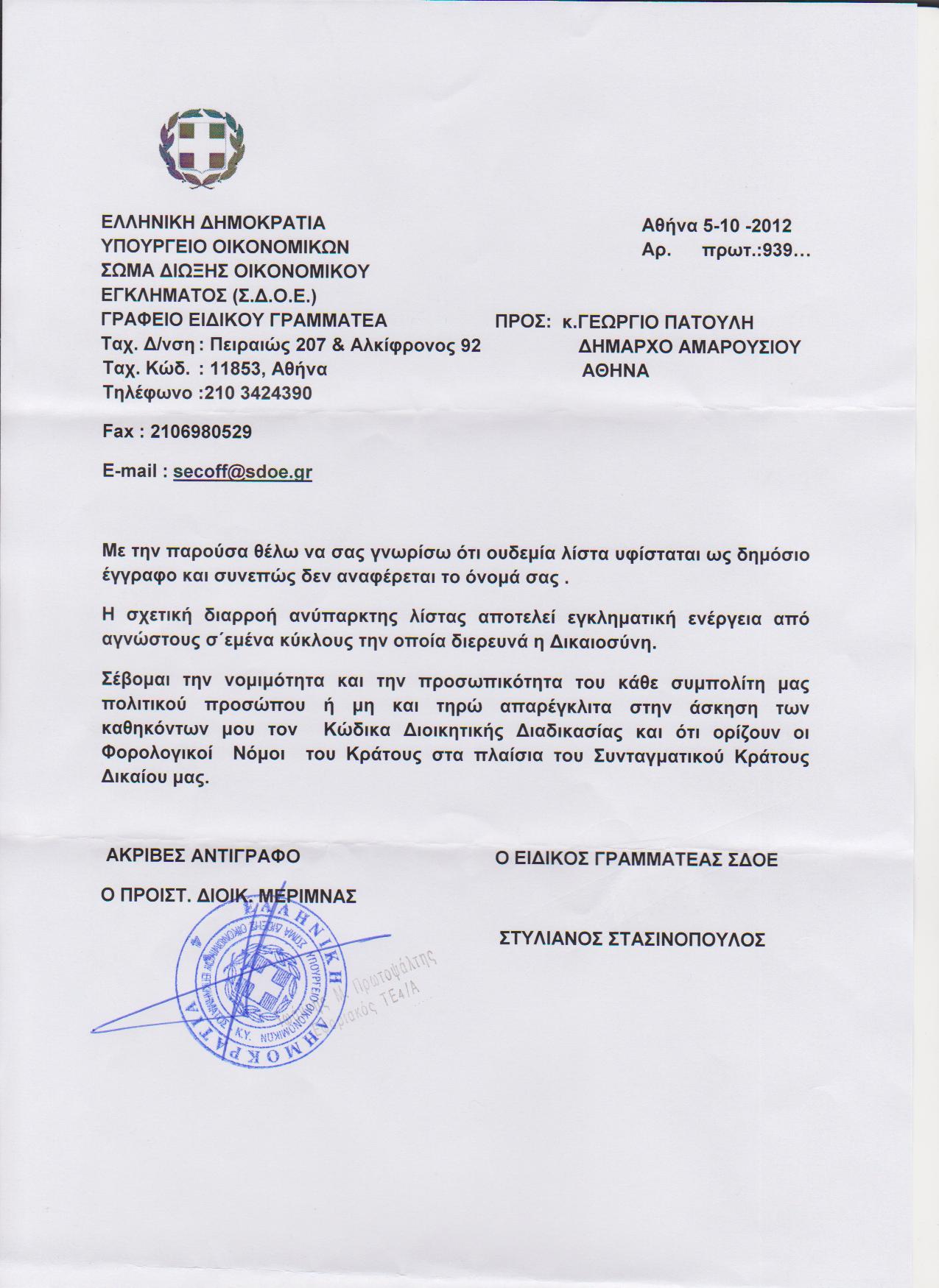 Με επιστολή που απέστειλε στο Δήμαρχο Αμαρουσίου Γιώργο Πατούλη, ο Ειδικός Γραμματέας του ΣΔΟΕ Σ. Στασινόπουλος, αναγράφεται ότι δεν υπάρχει καμία λίστα ή δημόσιο έγγραφο στο οποίο να περιλαμβάνεται το όνομα του κ. Πατούλη, ως δήθεν ελεγχόμενου για παράνομο πλουτισμό.Στην επιστολή του ο κ. Στασινόπουλος, αναφέρει χαρακτηριστικά πως «η σχετική διαρροή ανύπαρκτης λίστας αποτελεί εγκληματική ενέργεια την οποία διερευνά η Δικαιοσύνη».
