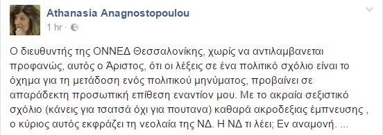 “Ο διευθυντής της ΟΝΝΕΔ Θεσσαλονίκης, χωρίς να αντιλαμβάνεται προφανώς, αυτός ο Άριστος, ότι οι λέξεις σε ένα πολιτικό σχόλιο είναι το όχημα για τη μετάδοση ενός πολιτικού μηνύματος, προβαίνει σε απαράδεκτη προσωπική επίθεση εναντίον μου. Με το ακραία σεξιστικό σχόλιο (κάνεις για τσατσά όχι για πουτάνα) καθαρά ακροδεξιας έμπνευσης, ο κύριος αυτός εκφράζει τη νεολαία της ΝΔ. Η ΝΔ τι λέει; Εν αναμονή…” έγραψε η κ. Αναγνωστοπούλου.