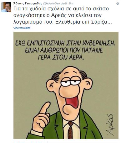 Μέσω του προσωπικού του λογαριασμού στο twitter σχολίασε ο κοινοβουλευτικός εκπρόσωπος της ΝΔ, Άδωνις Γεωργιάδης την αναστολή της λειτουργίας της επίσημης ιστοσελίδας του σκιτσογράφου, Αρκά, στο Facebook, παραθέτοντας και την επίμαχη φωτογραφία που προκάλεσε πλήθος αντιδράσεων: