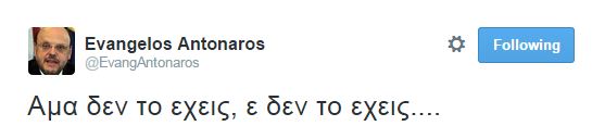 “Άμα δεν το έχεις, ε δεν το έχεις” έγραψε στον λογαριασμό στο Twitter ο εκπρόσωπος της κυβέρνησης Καραμανλή, Ευάγγελος Αντώναρος κατά την διάρκεια της ομιλίας του προέδρου της ΝΔ Αντώνη Σαμαρά στην Βουλή.