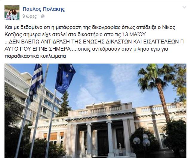 Με μία ανάρτηση στο Facebook, σχολίασε ο αναπληρωτής υπουργός Υγείας Παύλος Πολάκης, την επ’ αόριστον αναβολή της εκδίκασης της υπόθεσης Siemens, επισημαίνοντας ότι δεν υπάρχει αντίδραση από την Ένωση Δικαστών και Εισαγγελέων για την εξέλιξη αυτή.