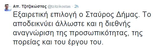 Ο Απόστολος Τζιτζικώστας έγραψε χαρακτηριστικά: “Εξαιρετική επιλογή ο Σταύρος Δήμας. Το αποδεικνύει άλλωστε και η διεθνής αναγνώριση της προσωπικότητας, της πορείας και του έργου του”.