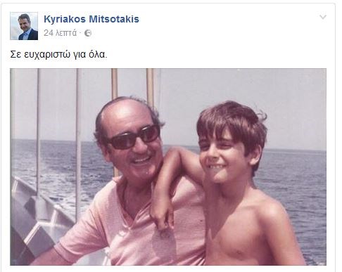 Ο πρόεδρος της Νέας Δημοκρατίας, Κυριάκος Μητσοτάκης, ανέβασε στον λογαριασμό του στο Facebook μια παιδική του φωτογραφία με τον πατέρα του Κωνσταντίνο Μητσοτάκη με την λεζάντα: “Σε ευχαριστώ για όλα”.