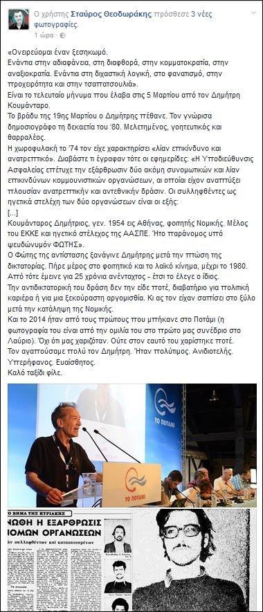 Με μια συγκινητική ανάρτηση στην επίσημη σελίδα του στο Facebook, ο Σταύρος Θεοδωράκης αποχαιρέτησε το στέλεχος του Ποταμιού Δημήτρη Κουμάνταρο, που άφησε την τελευταία του πνοή σε ηλικία 63 ετών. Ο Δημήτρης Κουμάνταρος ήταν δημοσιογράφος και αγωνιστής κατά της χούντας.Ο Σταύρος Θεοδωράκης τον αποχαιρέτησε με αυτό το κείμενο: