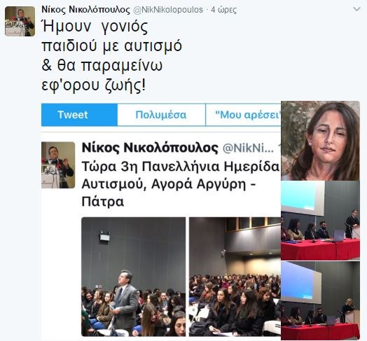 Συγκίνηση προκαλεί η ανάρτηση που έκανε στον προσωπικό του λογαριασμό στο twitter ο ανεξάρτητος βουλευτής και Πρόεδρος του Χριστιανοδημοκρατικού Κόμματος Ελλάδος Νίκος Νικολόπουλος.«Ήμουν γονιός παιδιού με αυτισμό και θα παραμείνω εφ’ όρου ζωής» αναφέρει ο κ. Νικολόπουλος.«Όταν συνειδητοποιείς πλήρως την τεράστια απώλεια, αλλά και το ιερό δικαίωμα των παιδιών με αυτισμό για ποιοτική ζωή, τότε οφείλεις ως ελάχιστο χρέος να παραμένεις γονιός παιδιού με αυτισμό εντείνοντας τον αγώνα για την ανακούφιση τους!!! Μαζί τους εφ’ όρου ζωής» δήλωσε ο κ. Νικολόπουλος με αφορμή την συμμετοχή του στην 3η Πανελλήνια Ημερίδα Αυτισμού που έγινε στην Πάτρα.