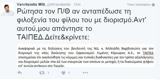 Σημειώνεται ότι ο κ. Βαρβιτσιώτης κατήγγειλετον διορισμό του “συμφοιτητή του Πρωθυπουργού και Αντιδήμαρχο Ερείκουσας, Ανδρέα Γουλή, ο οποίος τον φιλοξενεί εκεί κάθε χρόνο”.