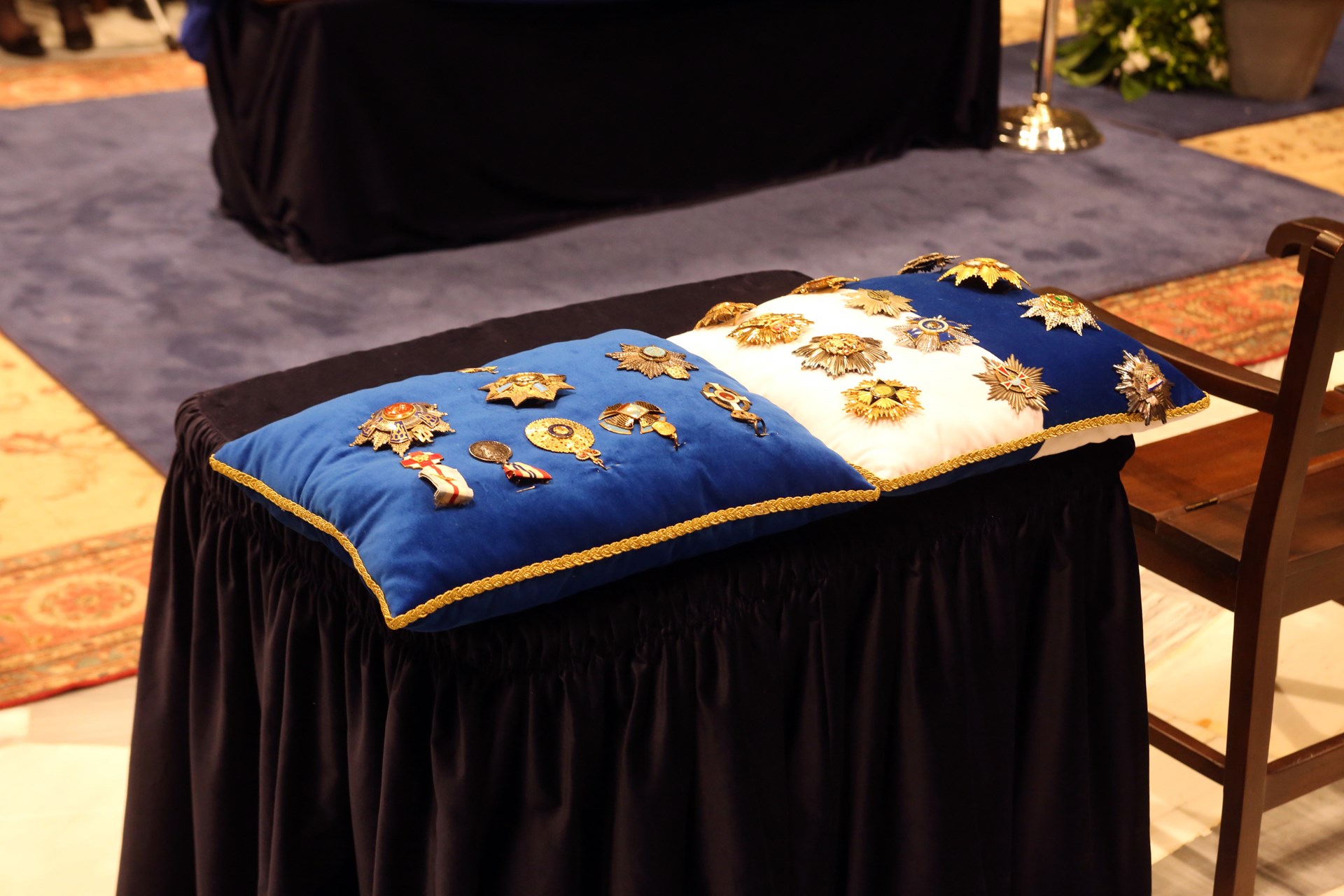 Τα παράσημα του πρώην πρωθυπουργού Κωνσταντίνου Μητσοτάκη η σορός του οποίου έχει τεθεί σε λαϊκό προσκύνημα στη Μητρόπολη