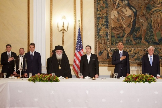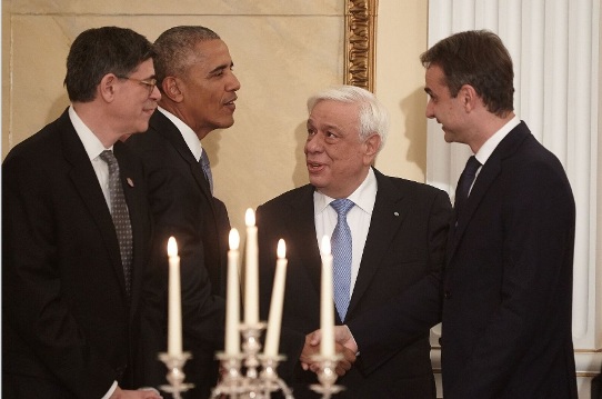 Θερμή χειραψία με τον Πρόεδρο Ομπάμα στο Προεδρικό Μέγαρο κατά τη διάρκεια του δείπνου που δόθηκε προς τιμή του Αμερικανού προέδρου είχε ο Κυριάκος Μητσοτάκης.