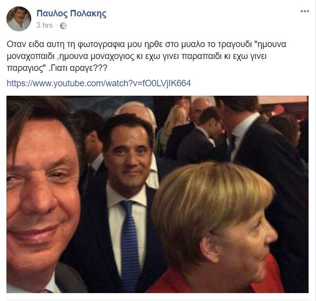 “Όταν είδα αυτή τη φωτογραφία μου ήρθε στο μυαλό το τραγούδι “ήμουνα μοναχοπαίδι, ήμουνα μοναχογιός κι έχω γίνει παραπαίδι κι έχω γίνει παραγιός”. Γιατί άραγε???” έγραψε ο Παύλος Πολάκης ανεβάζοντας και το τραγούδι του Στράτου Διονυσίου “Αφιλότιμη”.