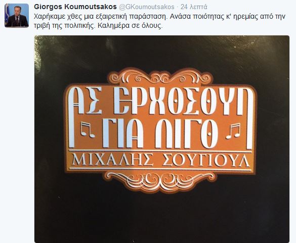 Στο μήνυμά του ο κ. Κουμουτσάκος έγραψε: «Χαρήκαμε χθες μια εξαιρετική παράσταση. Ανάσα ποιότητας και ηρεμίας από την τριβή της πολιτικής. Καλημέρα σε όλους», ενώ ανέβασε μία φωτογραφία με το τραγούδι του Μιχάλη Σουγιούλ, «Ας ερχόσουν για λίγο».