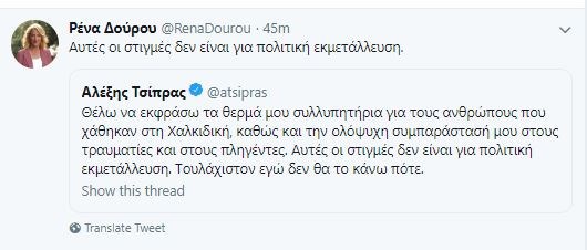 “Αυτές οι στιγμές δεν είναι για πολιτική εκμετάλλευση” αναφέρει η Ρένα Δούρου σε ανάρτησή της στο twitter σχετικά με τη φονική κακοκαιρία που έπληξε τη Χαλκιδική. Η απερχόμενη περιφερειάρχης Αττικής αναδημοσιεύει και τη δήλωση του Αλέξη Τσίπρα για τη θεομηνία.