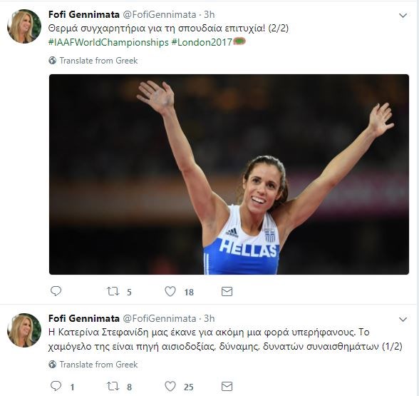 Θερμά συγχαρητήρια απένειμε μέσω Twitter στην παγκόσμια πρωταθλήτρια, Κατερίνα Στεφανίδη η πρόεδρος του ΠΑΣΟΚ και επικεφαλής της Δημοκρατικής Συμπαράταξης, Φώφη Γεννηματά.
