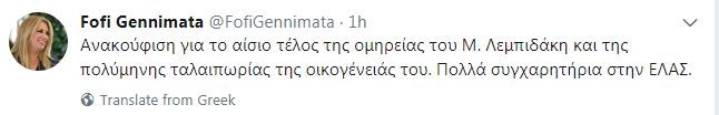 Συγχαρητήρια στην Ελληνική Αστυνομία έδωσε μέσω του λογαριασμού της στο Twitter η Φώφη Γεννηματά, με αφορμή την επιχείρηση απελευθέρωσης του επιχειρηματία Μιχάλη Λεμπιδάκη.«Ανακούφιση για το αίσιο τέλος της ομηρείας του Μ. Λεμπιδάκη και της πολύμηνης ταλαιπωρίας της οικογένειάς του. Πολλά συγχαρητήρια στην ΕΛΑΣ», έγραψε η Πρόεδρος του ΠΑΣΟΚ και Επικεφαλής της Δημοκρατικής Συμπαράταξης ανάρτησε πριν από λίγο στα social media: