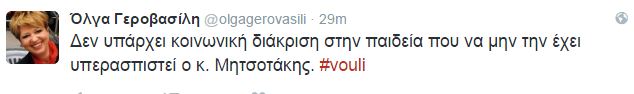 Με ανάρτησή της στο twitter η κυβερνητική εκπρόσωπος Όλγα Γεροβασίλη σχολίασε αναφορικά με την ομιλία του προέδρου της ΝΔ, Κυριάκου Μητσοτάκη στη Βουλή, στην προ ημερησίας διατάξεως συζήτηση για την Παιδεία: