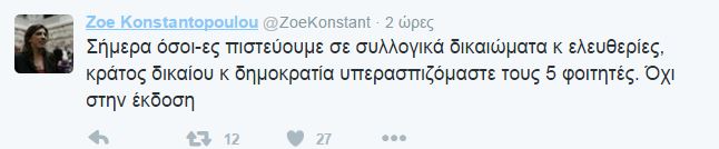 Με ένα tweet εκφράζει η πρώην Πρόεδρος της Βουλής, Ζωή Κωνσταντοπούλου τη στήριξη της στους πέντε φοιτητές που διώκονται με ευρωπαϊκό ένταλμα σύλληψης από τις ιταλικές αρχές με αφορμή τη συμμετοχή τους στη διαδήλωση της Πρωτομαγιάς του 2015 στο Μιλάνο. Διαβάστε αναλυτικά όσα έγραψε στο Twitter.
