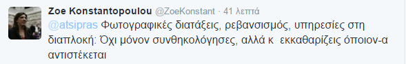“Φωτογραφικές διατάξεις, ρεβανσισμός, υπηρεσίες στη διαπλοκή: Όχι μόνον συνθηκολόγησες, αλλά κ εκκαθαρίζεις όποιον-α αντιστέκεται”, έγραψε η Ζωή Κωνσταντοπούλου στο twitter.
