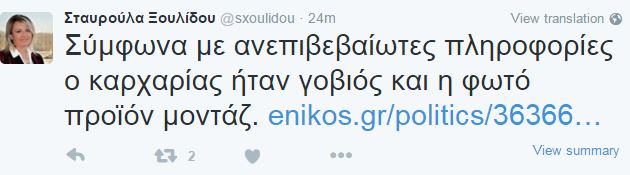 Τη φωτογραφία που ανήρτησε στον προσωπικό του λογαριασμό στο twitter ο υπουργός Εθνικής Άμυνας Πάνος Καμμένος με ένα καρχαρία τον οποίο έπιασε ένας ψαράς από τον Πόρο, σχολίασε η Σταυρούλα Ξουλίδου.