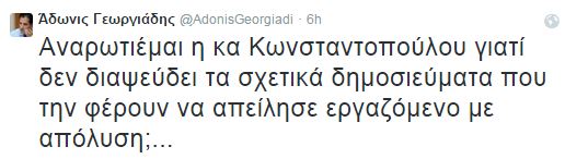 “Αναρωτιέμαι η κυρία Κωνσταντοπούλου γιατί δεν διαψεύδει τα σχετικά δημοσιεύματα που την φέρουν να απείλησε εργαζόμενο με απόλυση;” έγραψε χαρακτηριστικά ο κοινοβουλευτικός εκπρόσωπος της ΝΔ.