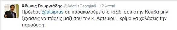 “Πρόεδρε @atsipras σε παρακαλούμε στο ταξίδι σου στην Κούβα μην ξεχάσεις να πάρεις μαζί σου τον κ. Αρτεμίου…κρίμα να χαλάσεις την παράδοση” έγραψε ο κ. Γεωργιάδης στον λογαριασμό του στο twitter.